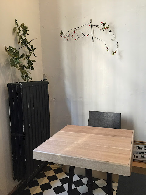 Ein, für mich, junger und typisch belgischer Interieur Style. Naturtöne und Schwarz dominieren den Belgischen-Style. In Sofies TeaKoff bricht eine magenta rote Wand das unscheinbar, ruhige Ambiente.